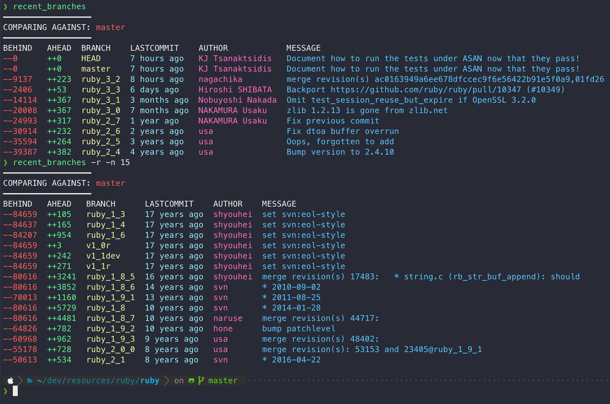 I’ve been using this for various tasks, but the most common one is to identify stale old branches that are great candidates for deletion. When I run git branch --all, I don’t want to parse a cluttered branch list littered with branches from yesteryear that will likely never be merged or used again. Now this doesn’t really apply to long supported or archived release branches, such as those exhibited in the ruby repository example below; There are good reasons to keep those around, however ancient feature branches can often just be deleted. When feature branches are months to years old and far behind the main branch commit history, it’s highly improbably that the work will ever be merged in. I tend towards deleting these branches to reduce your cognitive load and focus your attention.