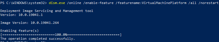 dism.exe /online /enable-feature /featurename:VirtualMachinePlatform /all /norestart -