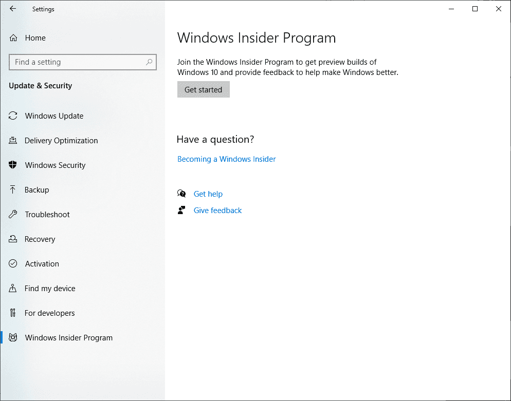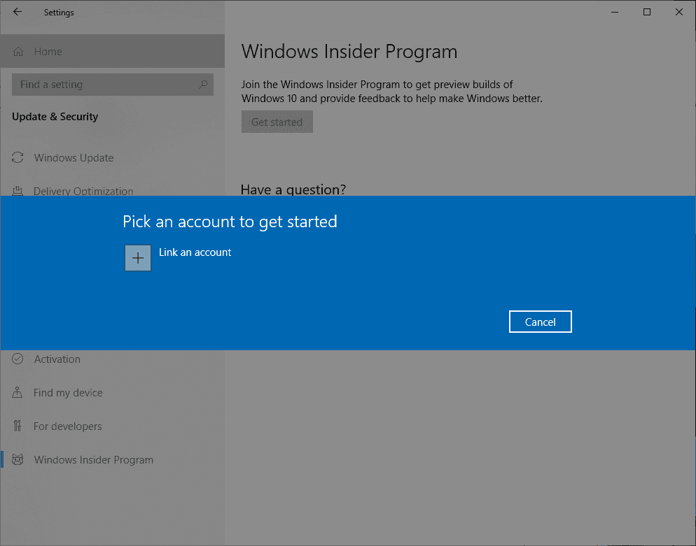 Click Get Started and link the account that you used to register as a Windows Insider.